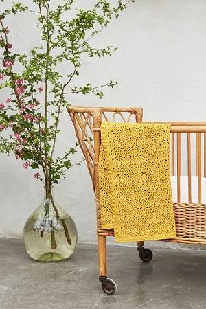Mooi en zacht ceylon geel gebreid dekentje van Rose in April met een kantpatroon. Handig om in de buggy te gebruiken, in de zetel of voor in bed. Vervaardigd uit een hoogwaardig katoen en het garandeert daarmee een lange levensduur.