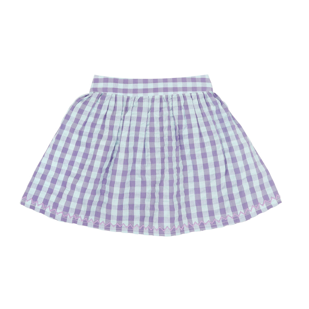 De rok heeft een luchtig model en een elastische tailleband, waardoor hij comfortabel zit én mooi valt. De blauw-lila geruite print geeft een frisse zomerlook, terwijl het subtiele zigzagborduursel onderaan een extra speels detail toevoegt. Gemaakt van 100% biologisch katoen – zacht voor de huid en duurzaam geproduceerd.