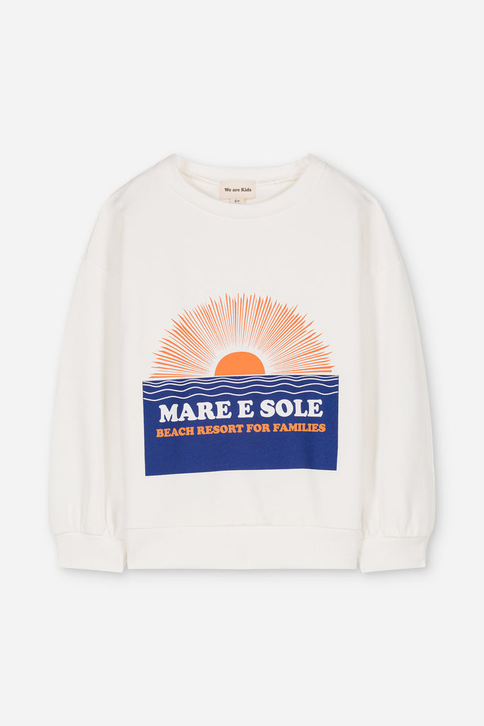 Deze sweater is gemaakt van hoogwaardig molleton van 100%  biologisch katoen en biedt een ultiem comfort voor dagelijkse avonturen. Met zijn ronde hals en ton-sur-ton ribboorden straalt deze sweater een subtiele en eigentijdse uit. De witte kleur wordt opgefleurd met een levendige print van 'Mare e Sole', wat zee en zon betekent in het Italiaans.