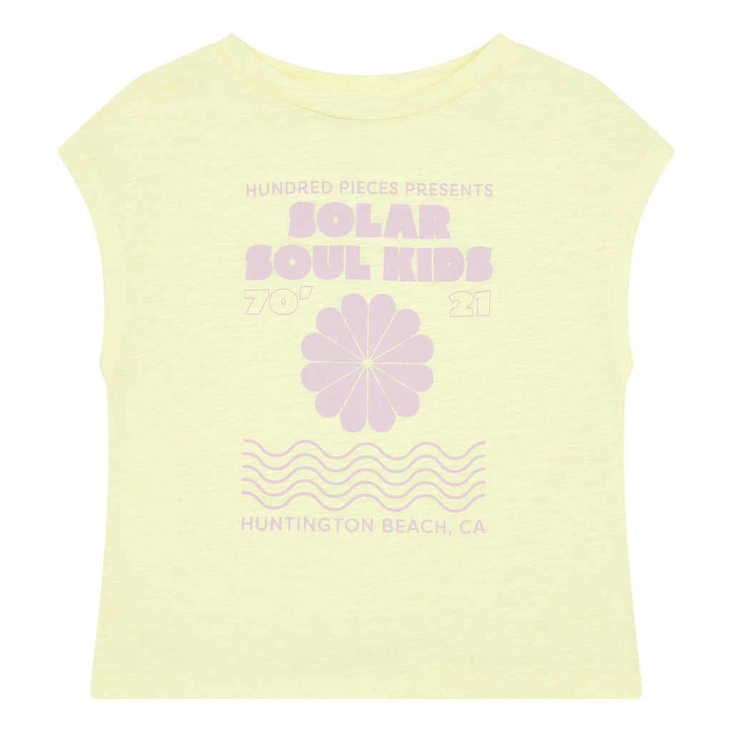 Comfortabele mouwloze gele T-shirt met ronde hals en met vintage print 'Solar Soul Kids' op de voorzijde.