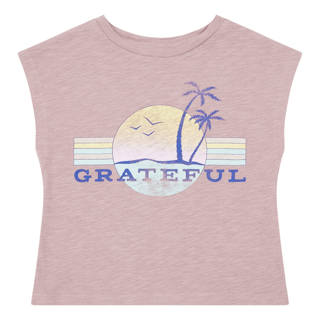 Comfortabele mouwloze lila T-shirt met ronde hals en met vintage print 'Grateful' op de voorzijde.