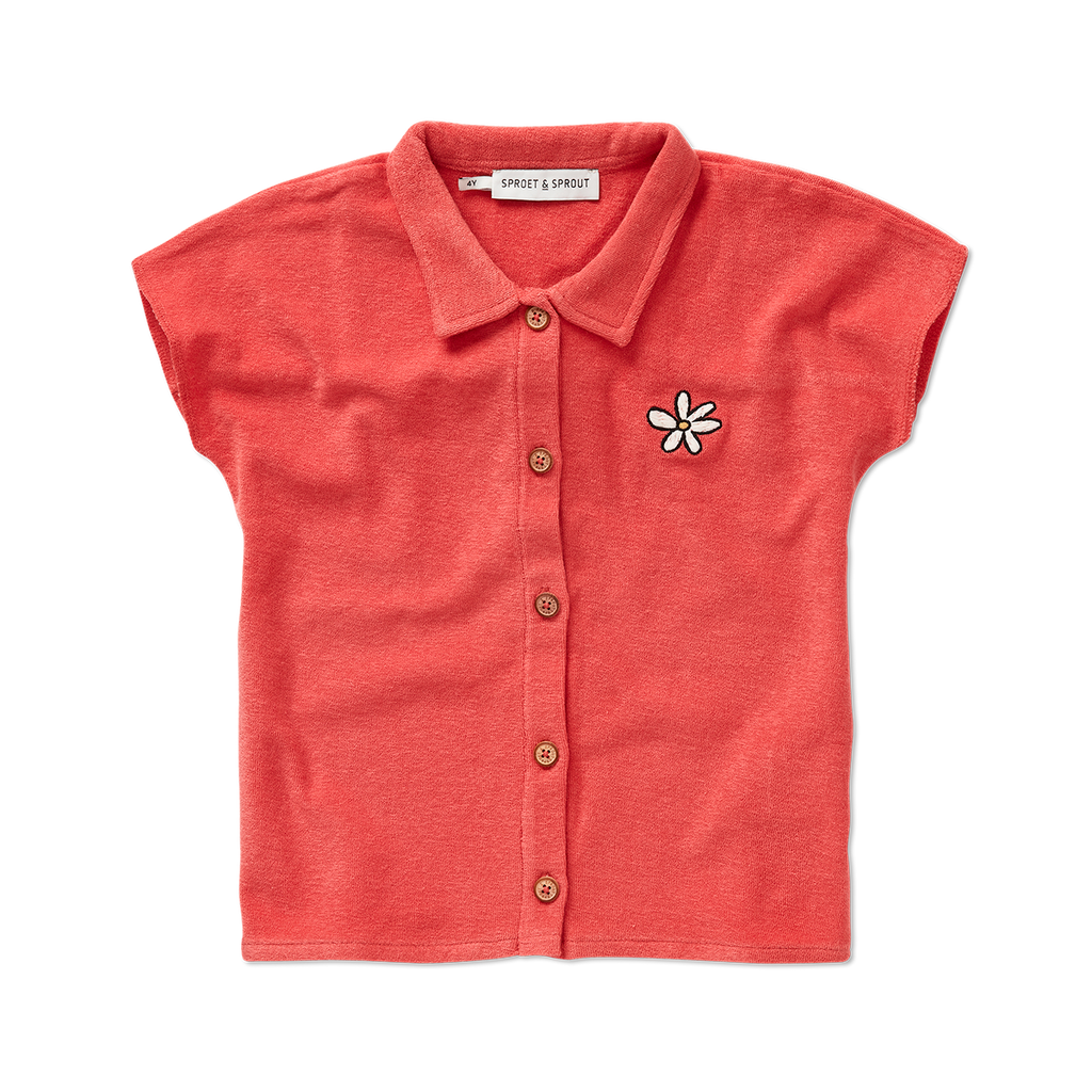 De zachte badstof zorgt voor een comfortabele pasvorm, terwijl het schattige bloemenborduursel op de borst een speelse uitstraling geeft. De blouse heeft een elegante kraag en een knoopsluiting aan de voorkant, perfect voor zowel casual als geklede looks.