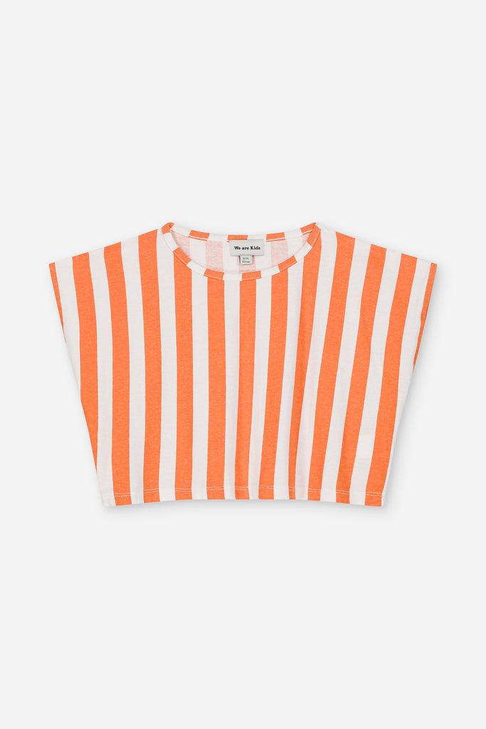 Dit topje Jodie met oranje strepen uit de Postcard collectie van we are kids is de perfecte keuze voor meisjes die houden van een kleurrijke en speelse zomerlook.