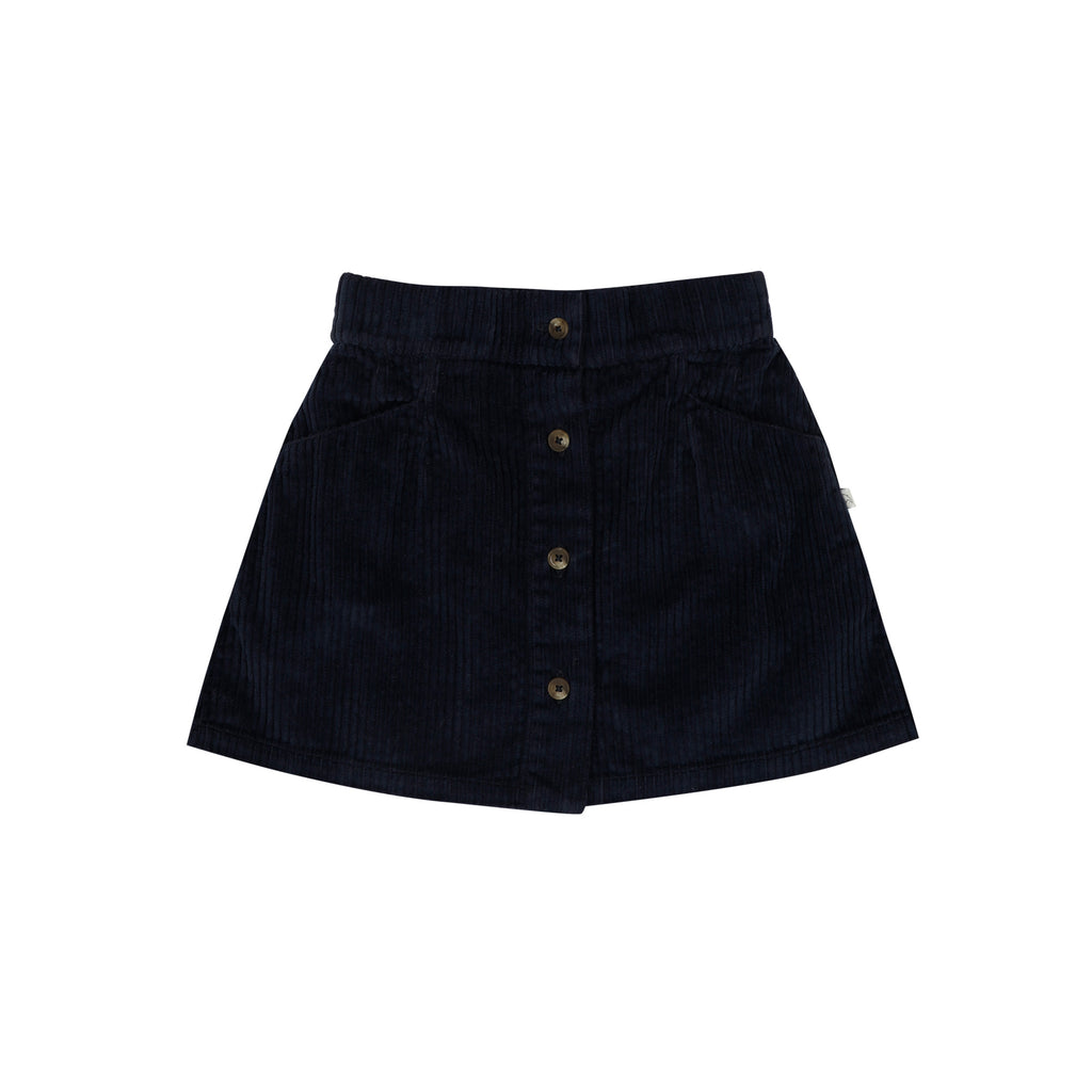 Dit donkerblauwe ribfluwelen rokje van Jenest is een tijdloze basic met een speelse twist. De Bibi Skirt is gemaakt uit superzacht biologisch katoen en heeft een comfortabele elastische tailleband, handige steekzakken en een knoopsluiting vooraan.