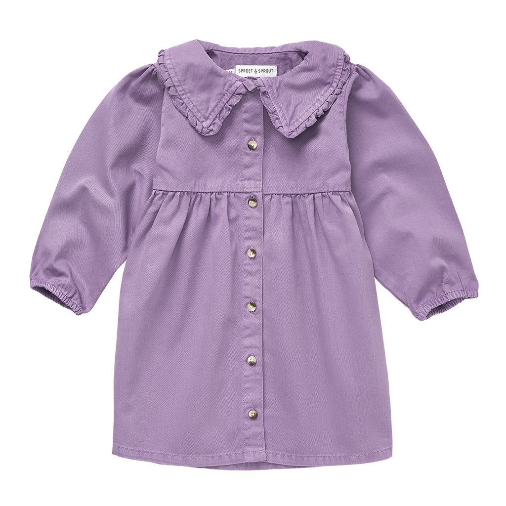 Dit denim kleedje in een zachte paarse tint is een tijdloze favoriet. Het kleedje heeft een opvallende kraag met subtiele ruffles en sluit met knopen aan de voorkant. De pofmouwen en lichte plooitjes in de taille geven het een charmante en elegante uitstraling.