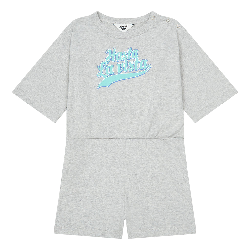 Grijze playsuit met ronde hals, 3/4 mouwen en print op de voorzijde 'Hasta La Vista'. Deze playsuit zit comfortabel.