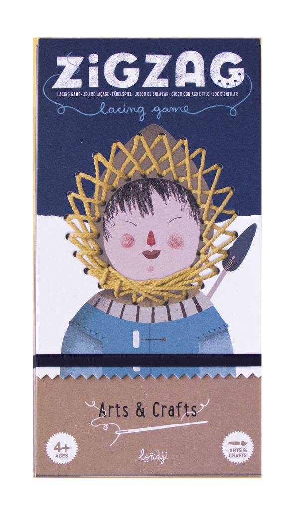 Dit borduurpakket heeft alles om te leren naaien: gekleurde wol, 2 naalden die niet prikken en 8 kartonnen sjablonen.