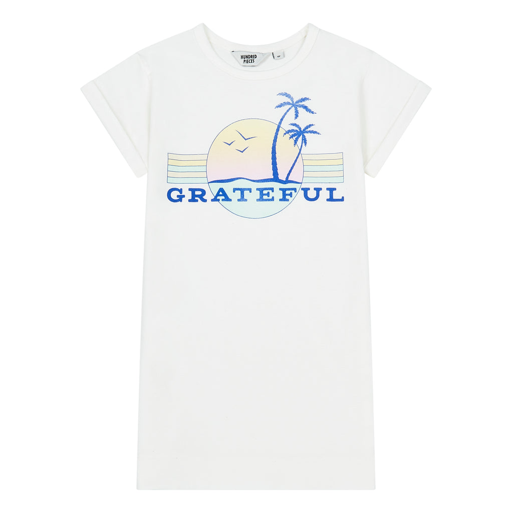 Comfortabele T-shirt Dress met ronde hals, korte mouwen en vintage print 'Grateful' op de voorkant.