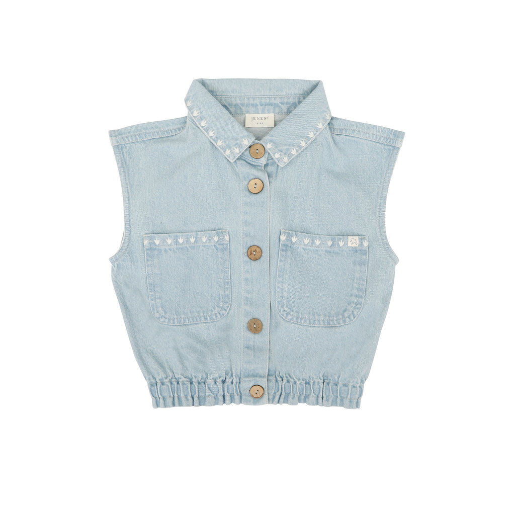 Op zoek naar een stoer maar stijlvol item voor je dochter haar zomergarderobe? Dan is dit lichtblauw denim gilet van Jenest een echte topper.