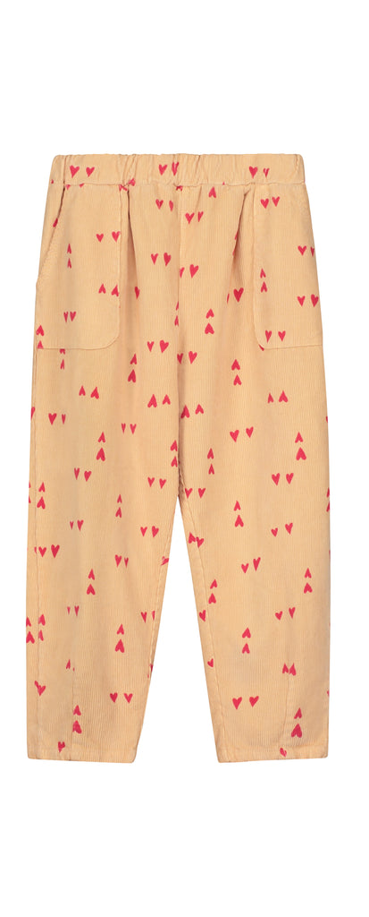 Ribfluwelen broek voor meisjes in het licht mosterd met een all-over hartjesprint. Deze broek heeft een elastische tailleband, zakken aan de voorkant.
