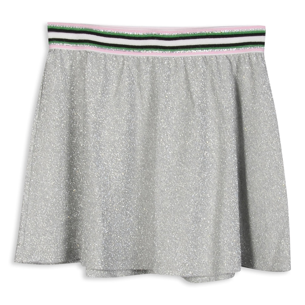 Prachtig plooi rokje in blinkende, lichtblauwe stof. In de taille is er een brede rekker in wit/zwart.